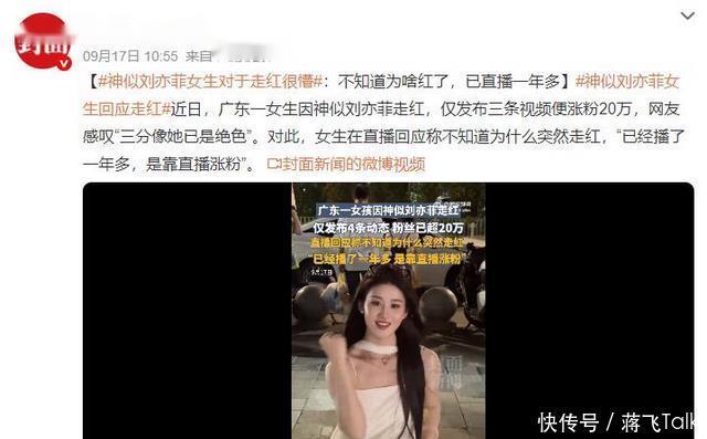 她说自己没整容,是“纯天然的”,她也坦承给自己取这个名字确实是有借助刘亦菲的影响力博眼球的心态。 这些言论对于她这种类型的网红来说,比“假装自己没模仿”反而更讨好一些观众。毕竟大家心里都明白,神似顶流明星的脸,是一种资源,少一点虚伪,也多点人情味。